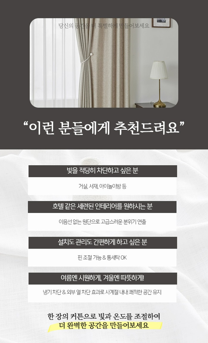 인테리어를 할 경우에는 소소한 것도 놓치지 않게 하는 것이 중요하다 할 수가 있는데요.창문을 통해서 들어오는 따스한 햇살과 창밖으로 풍경 역시도 바쁜 일상안에서도 아주 작은 여유를 선사하여 주고는 하는데요.그러나, 종종 그러한 햇살이 너무나도 강렬하게끔 느껴지기도 하면서, 밤만 되면 또 외부로부터의 시선으로부터 프라이버시를 지키고 싶은 상황들이 발생하기도 합니다.